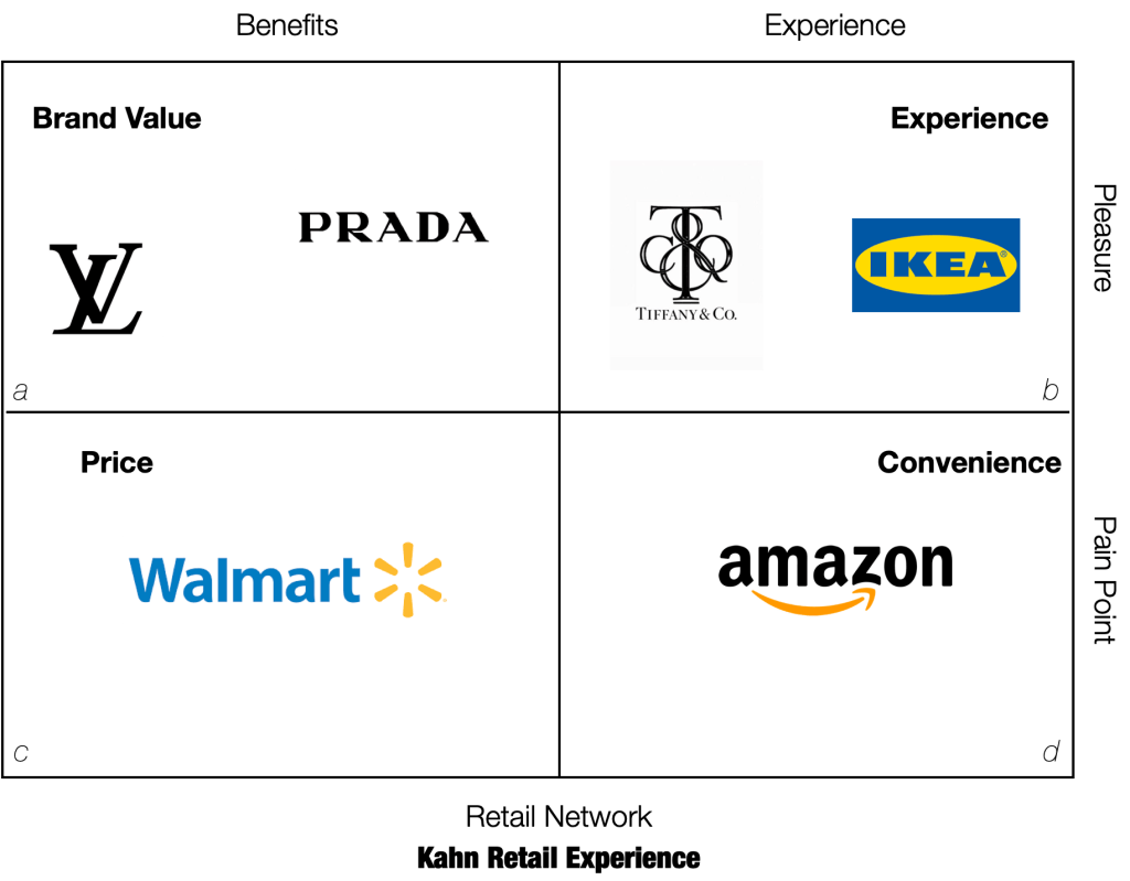Quadrant A defines the brands that seek high value by positioning and customers are influenced by the brand affinity, Quadrant B is the experiential and the customers seek pleasure through the retail offering (in store experience or digital offering). Quadrant C is strictly driven by price and D is by convenience of shopping;